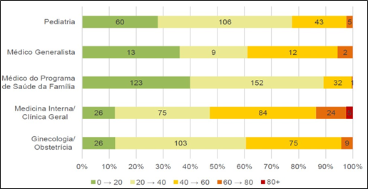 - As especialidades de medicina interna/clínica geral ficaram com tempos médios de espera maiores no geral, com mais serviços situados na faixa entre 40 a 60 dias de tempo médio de espera.