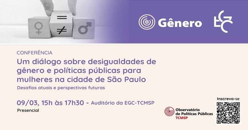 O Grupo de Trabalho (GT) Gênero do Observatório de Políticas Públicas do TCMSP realizará, em 09 de março, a conferência "Um diálogo sobre desigualdades de gênero e políticas públicas para mulheres na cidade de São Paulo: desafios atuais e perspectivas futuras". O encontro, que será presencial, tem início às 15 horas e poderá ser acompanhado virtualmente pelo Canal da Escola de Gestão e Contas (EGC) do TCMSP no Youtube.