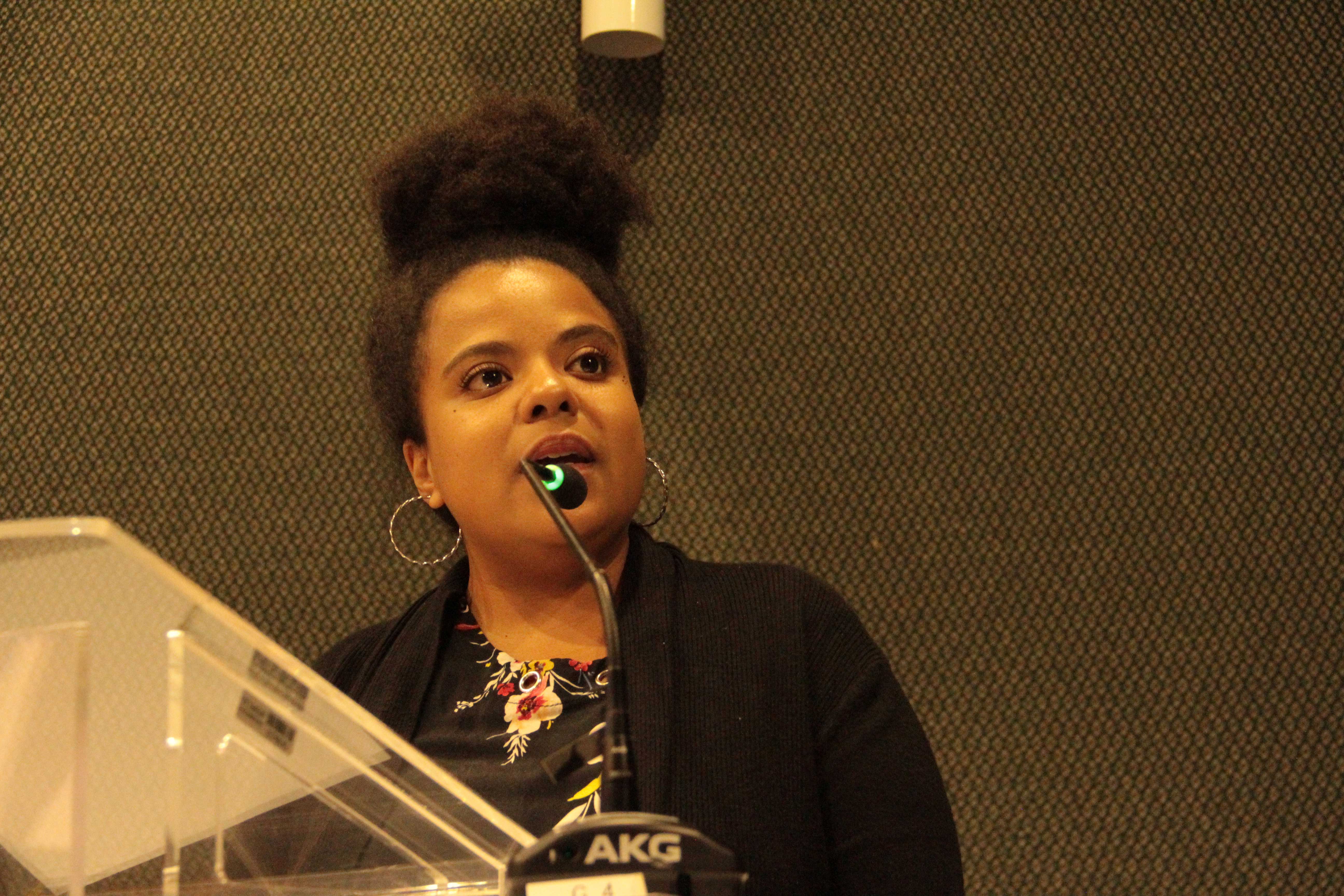 Em sua participação, a jornalista e professora Andrea Rosendo abordou as referências intelectuais utilizadas para subsidiar os estudos na área do Direito e tratou de dois recortes importantes: “Quem são os teóricos que falam com as mulheres, quem os que falam com a população negra e quem são os teóricos que falam com a população indígena?”, questionou. Sua exposição tomou como fio condutor a compreensão de cinco termos: diáspora, epistemologias do sul, pensamento decolonial, pensamento afro-diaspórico e o reconhecimento das pensadoras afro-latino-americanas e caribenhas. Em relação a essas últimas, Andrea Rosendo questionou o porquê de não serem colocadas entre as referências ao se estudar Direito, Sociologia, Comunicação ou Relações de Gênero na América Latina.