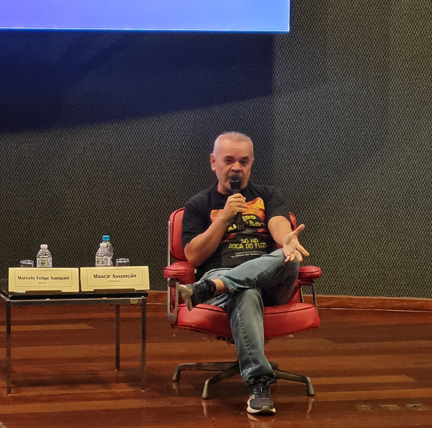 O auditório da Escola Superior de Gestão e Contas Públicas (EGC) se transformou em sala de cinema para exibir o documentário “Acordo com Lampião? Só na boca do fuzil”. Lançado neste mês de abril de 2024, o filme foi apresentado gratuitamente pelo Cineclube da Escola, na noite de segunda-feira (22/04). Após a exibição, o público participou de intenso debate, com uma hora de duração, reunindo o diretor Marcelo Felipe Sampaio e o roteirista Moacir Assunção.
