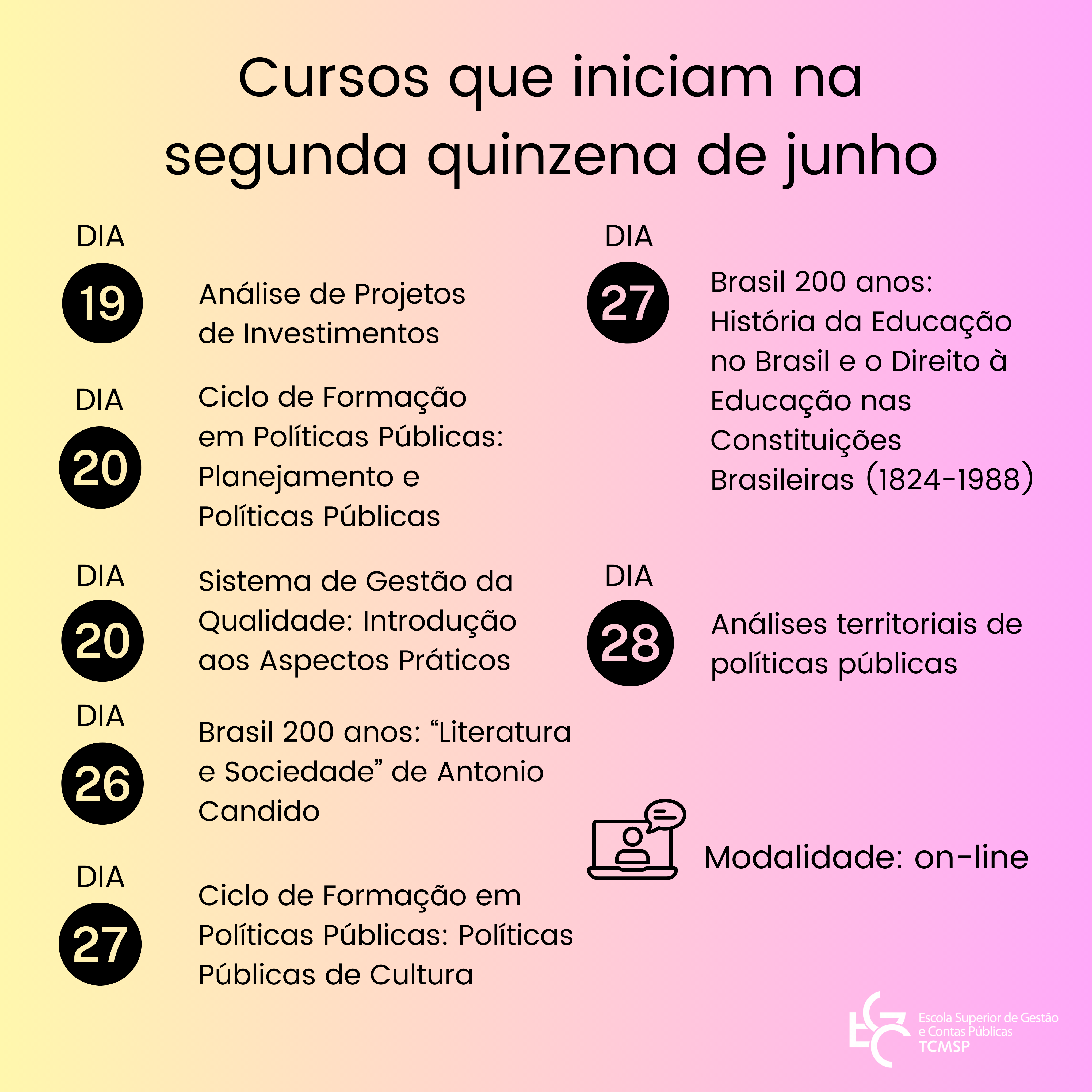 Para a segunda quinzena de junho, a Escola Superior de Gestão e Contas Públicas (EGC) oferecerá 7 novos cursos gratuitos, cuja inscrição poderá ser feita clicando sobre o nome do curso pretendido. Os temas abordados são variados indo da gestão pública à cultura. Conheça os conteúdos e faça sua inscrição.