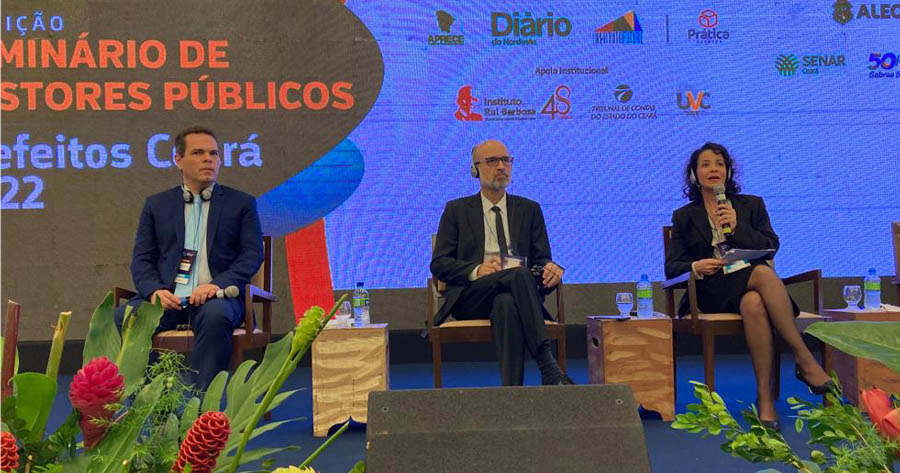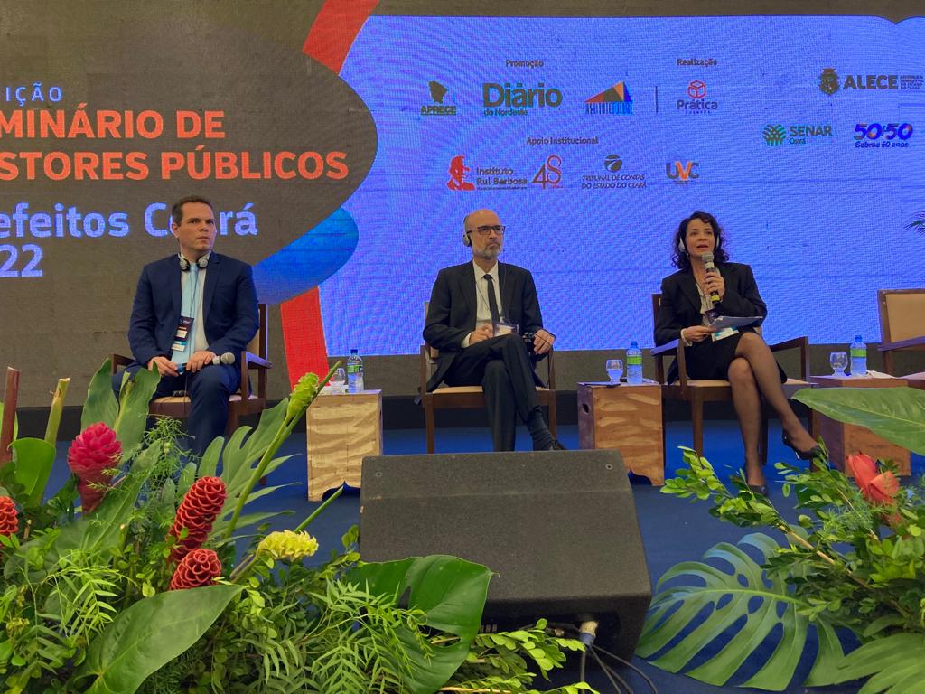 Nesta quinta-feira (23), a diretora-presidente da Escola de Gestão e Contas Públicas do TCMSP, profª Ana Carla Bliacheriene, e o chefe de gabinete, prof. Luciano Vieira de Araújo, participaram do segundo dia de palestras da X Edição do “Seminário de Gestores Públicos – Prefeitos Ceará 2022”.