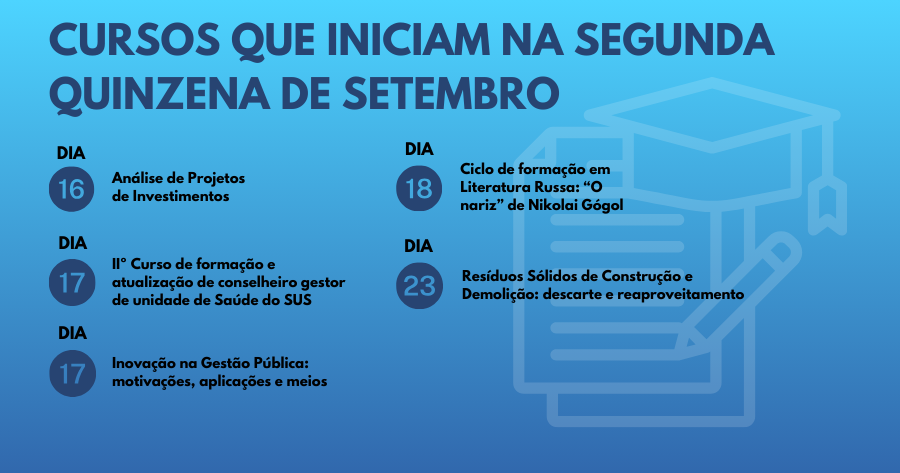 Os temas abrangem diversas áreas do conhecimento. Incluem análise de projetos de investimentos até o curso de descarte e reaproveitamento de resíduos sólidos de construção e demolição. Há opções também para aqueles que se interessam por gestão da saúde, literatura e orçamento público.