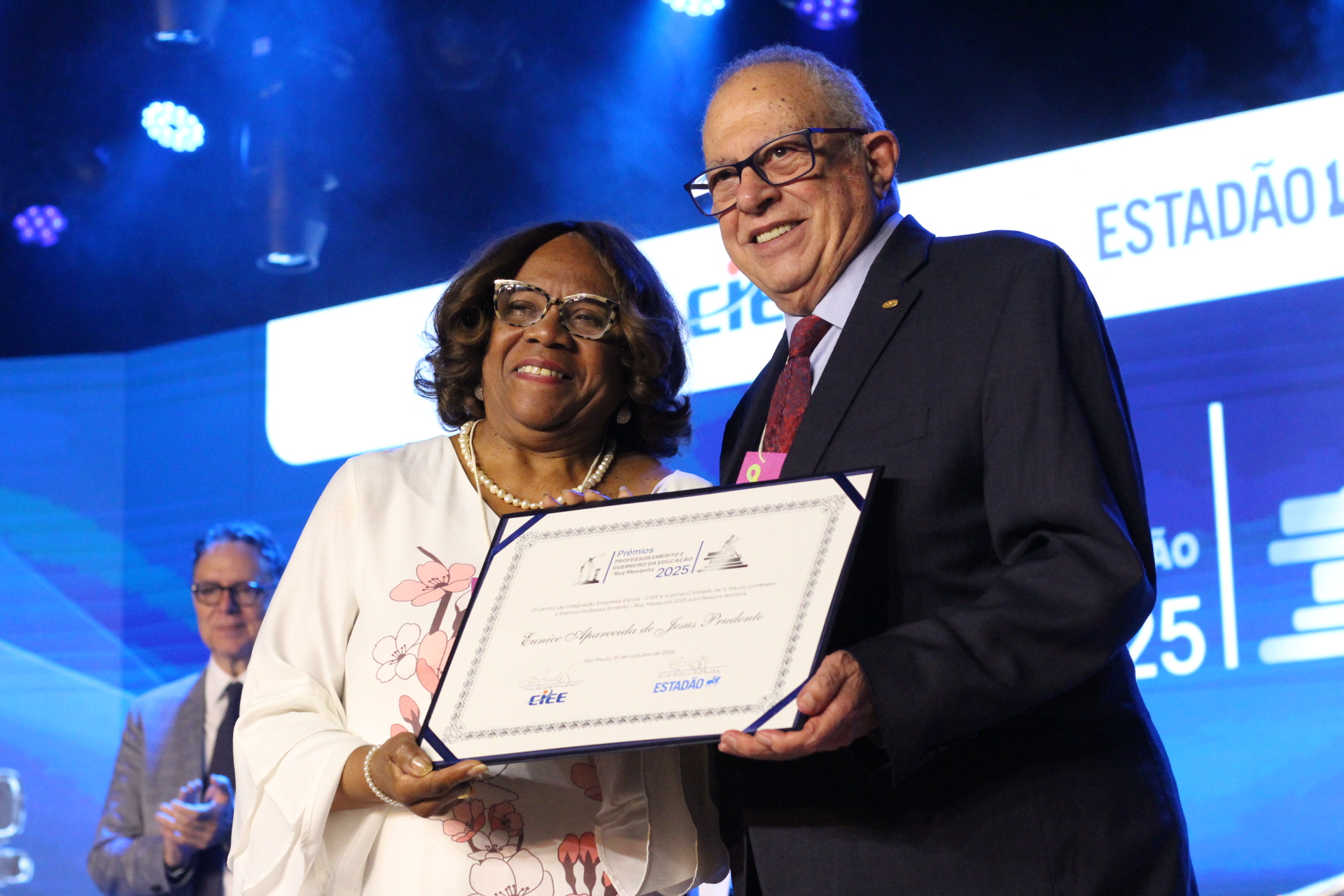 De acordo com a organização do evento, o Prêmio Professor Emérito é dedicado a quem efetivamente atua como professor, cujo trabalho deixa uma marca na história da educação do país ao fazer a diferença nessa atividade. “A professora Eunice Prudente recebe o Prêmio Professor Emérito de 2025 por sua notável trajetória no ensino e sua contribuição acadêmica”, anunciou o mestre de cerimônia no início da solenidade.