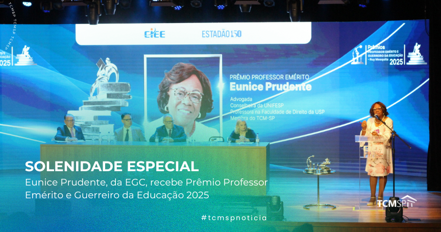 Durante solenidade especial realizada, nesta quarta-feira (15), a professora doutora Eunice Prudente, coordenadora de Parcerias e Convênios da Escola Superior de Gestão e Contas Públicas (EGC) do Tribunal de Contas do Município de São Paulo (TCMSP), foi agraciada com o Prêmio Professor Emérito 2025, juntamente com o educador Antonio Palma, ganhador do Troféu Guerreiro da Educação. O prêmio foi criado em 1997 pelo Centro de Integração Empresa-Escola (CIEE) e pelo jornal O Estado de S. Paulo.